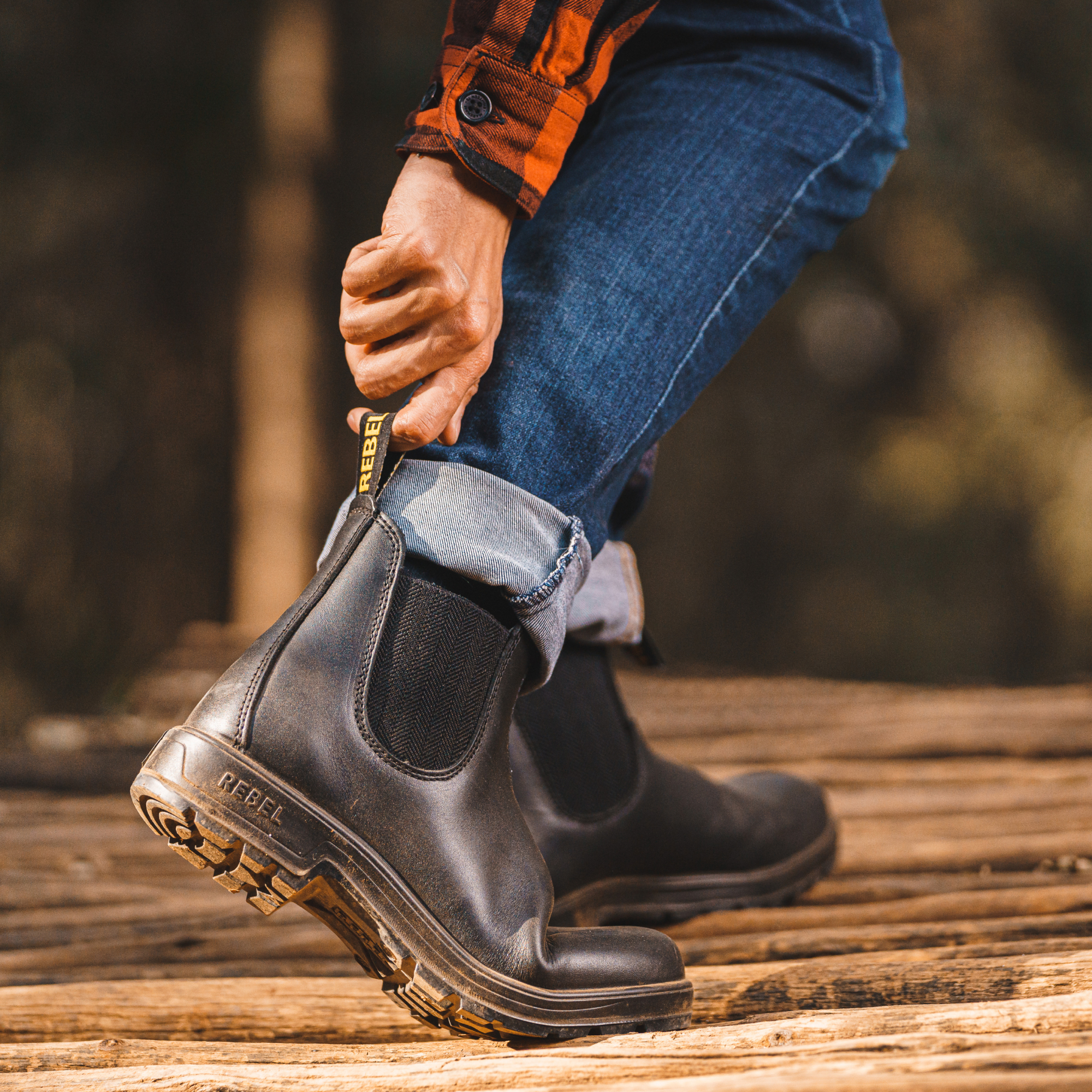 The new REBEL Urban Retro Classic Chelsea Boot not only looks great, it has the safety features to match. Available in black, dark brown and rustic brown, this lightweight, slip-on Chelsea boot boasts a premium v-cut leather upper with best-in-class durable elastic sides and finger loops to assist with quick and easy fitting.
